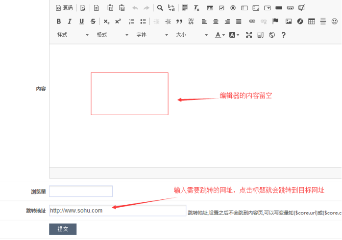 進入會員中心-----發布文章模型內容-----欄目選擇、標題名稱等按之前的方式填寫-----編輯器內容為空-------跳轉地址(輸入目標網址,必須帶上http)----最后提交