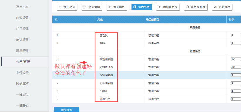 就存放在“常規編輯組”。 那些只有投稿權限的人,就放在“投稿員”角色下。 那些初審編輯組、終審編輯組,只有做多級審核