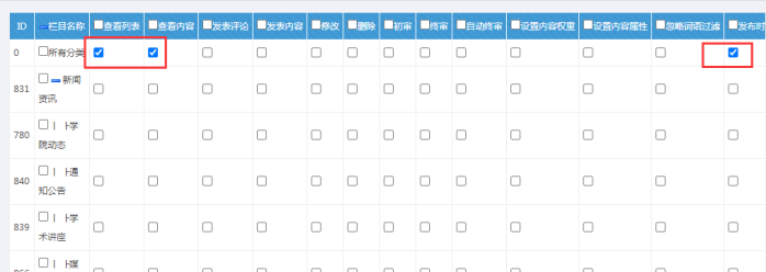 D:如果只要此人對某些欄目有發布權限,設置如下:(上級欄目必須勾選中,一般是自動的,否則無權限)