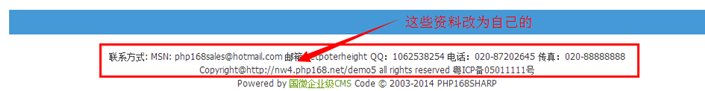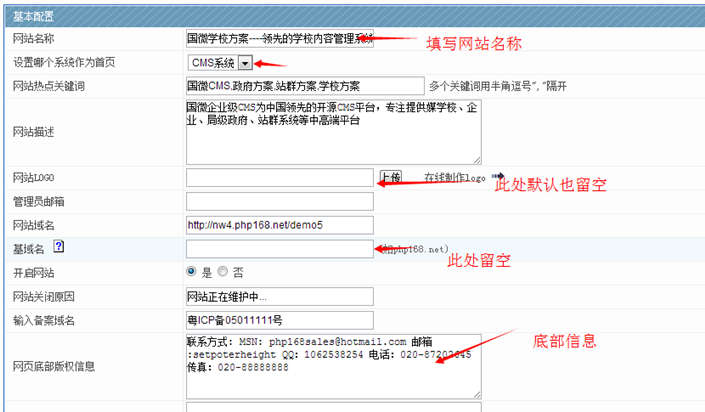 2、網站基本信息修改(改為你自己想要的):修改下網站名稱和描述;備案信息;底部聯系方式。