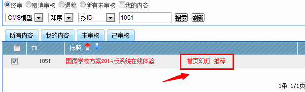 F、內容屬性設置:給任意某條內容設置屬性:前臺操作里面 "更多操作" 給內容設置屬性:推薦、首頁頭條、幻燈片頭條、頻道頭條。同時查看這些內容的屬性是否設置成功,后續的操作將會教會大家如何運用這些屬性。