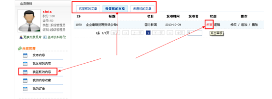 1、 張三 這個賬號發布一篇文章,然后admin這個管理員賬號進入會員中心審核(進行操作通過審核);張三在會員中心查看自己的內容審核狀態變化。