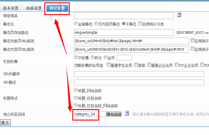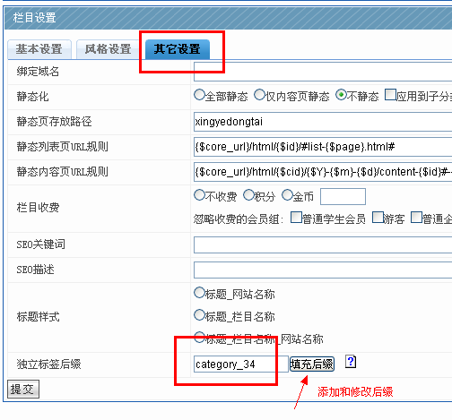 D、修改欄目后綴.一般我們現在將大列表的后綴留空,所有小列表的后綴設置相同,如全部設置為 category_34