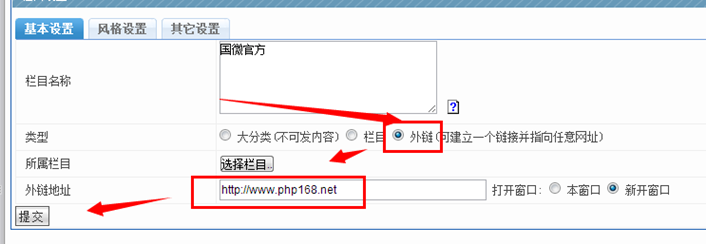 C、外鏈地址:添加一個名為"股票行情"的小欄目名稱,放在剛剛的"國際財經"上;使用外部鏈接,新窗口打開,鏈接到: