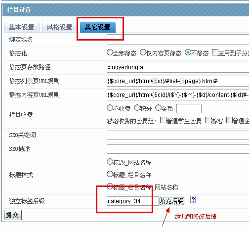 2) 單獨(dú)創(chuàng)建一個(gè)欄目、欄目后綴