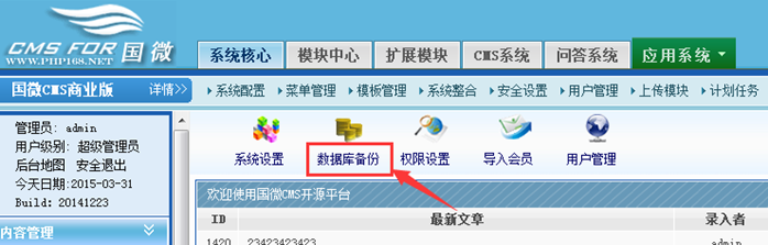 說明:備份數據極其重要,后臺備份數據是最簡單的方式,一般三天或一周就必須備份一次。點擊下即可。