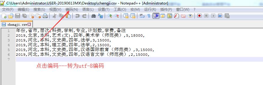 第二步:csv格式文件,用notepad++的代碼編輯軟件打開,找到頂部的 編碼-----轉為utf-8編碼-----另外為保存即可。