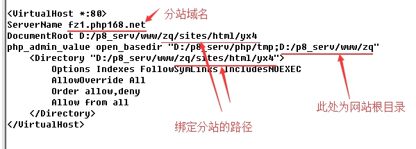 B:每一個(gè)分站配置,都會有下面一段這樣的設(shè)置;只是里面的域名設(shè)置和分站路徑不同而已。