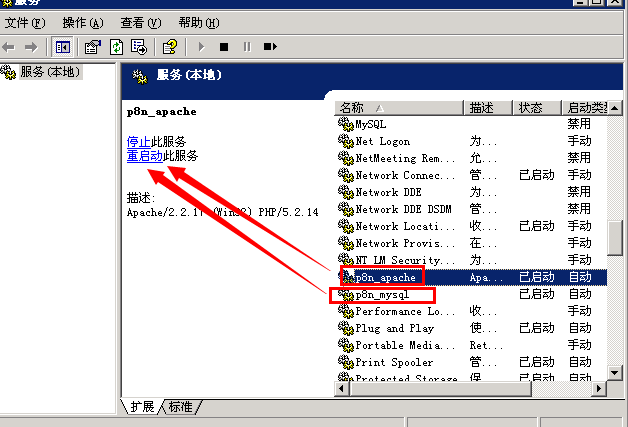 D:先后選擇 P8n—mysql P8n-apache都點擊重啟