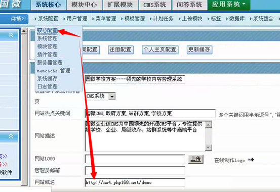 6、點擊核心設置,將網站域名改為現在的安裝域名或IP。基域名不需要填。