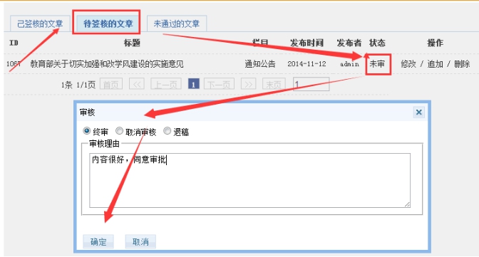 點(diǎn)擊“未審”按鈕,則可對(duì)內(nèi)容進(jìn)行審核處理,并寫審核評(píng)語(yǔ),用戶站內(nèi)信可以收到。