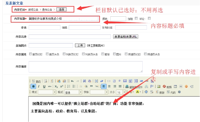 這樣一篇內(nèi)容就完成了;可以進(jìn)入欄目查看內(nèi)容效果,如果列表中沒有立刻顯示,則需要更新標(biāo)簽緩存;緩存后面有教程。