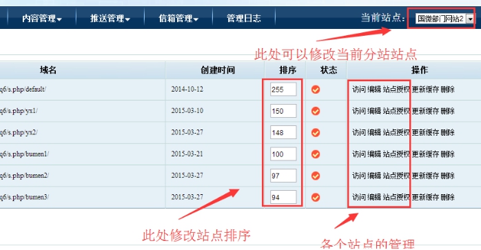 站點管理:右邊的幾個按鈕是各個站點管理;如果訪問地址、編輯按鈕、站點管理員授權等。