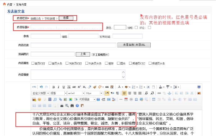 這個三個必填的是:內容欄目、內容標題、編輯器里面的主體內容
