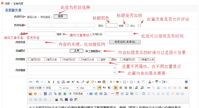 C:編輯:很多稿件我們需要寫上編輯人是誰,此處可以填寫;此處不是系統功能上的審核人。是否在內容頁顯示此字段,和模板有關。