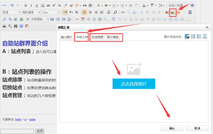 點擊編輯器此處的圖片圖標,可以快速上傳圖片
