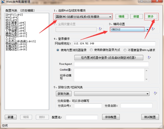 2、在彈出的界面當中,點擊“更多”按鈕,添加導入“國微CMS(站群分站)院系4發布模塊”,進行編碼設置、登錄操作,設置編碼為GB2312