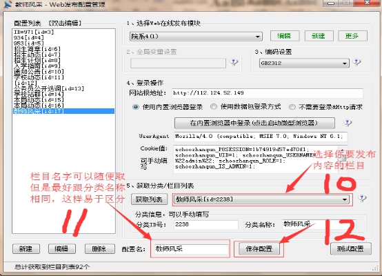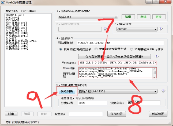 3-7 我們把上面抓包工具的所獲取的user-agent和cookie值粘貼到對應的區域,然后點擊獲取列表,選擇你所要發布的欄目(注意:選擇欄目時不要選擇一級欄目),具體步驟如下: