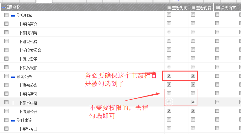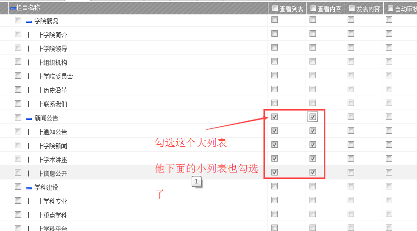如果你讓下屬欄目,個別欄目有權(quán)限,就只需勾選新聞公告后,去掉那些不要的欄目勾,即可。
