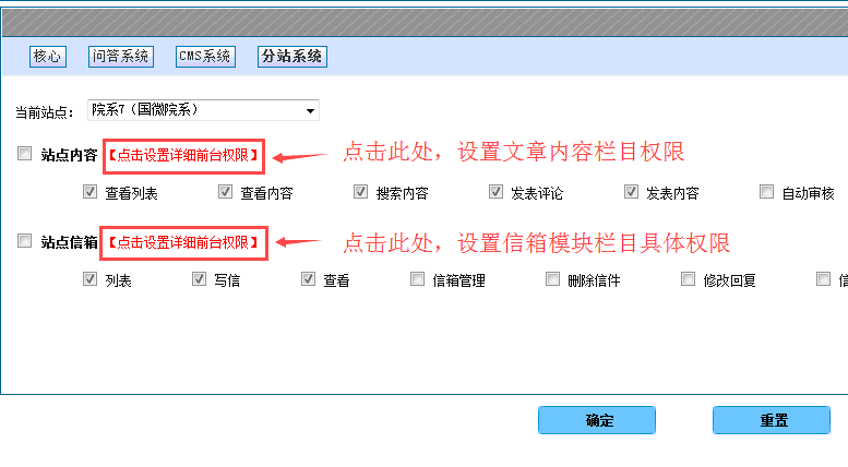 4、設(shè)置“站點內(nèi)容”和“站點信箱”的細(xì)分欄目權(quán)限