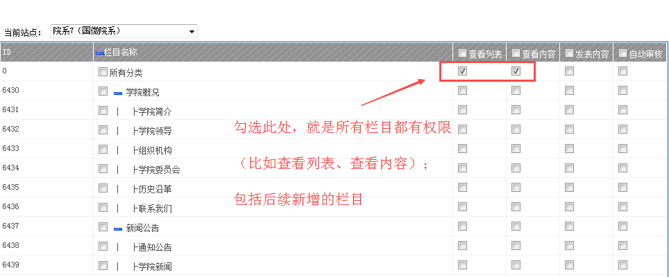 5、如何設(shè)置站點內(nèi)容(文章內(nèi)容)的細(xì)分欄目權(quán)限