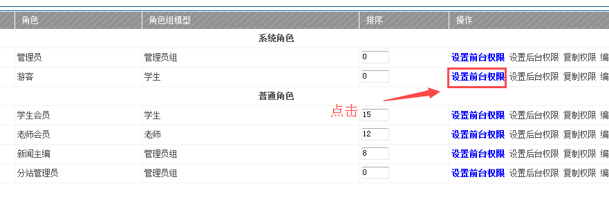 2、點擊游客角色的“設(shè)置前臺權(quán)限”;一般角色只需設(shè)置前臺權(quán)限即可 (分站管理員角色除外)