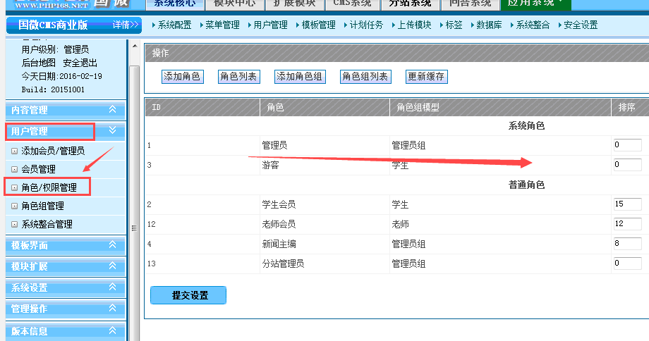 1、進(jìn)入后臺----點擊左邊的用戶管理----點擊“角色/權(quán)限管理”-----然后看到右邊的"游客"角色