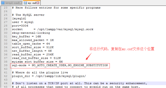 2)在目標項目中的my.conf數據庫配置文件中,將剛剛上面那行代碼復制到下面此處(當然可以其他地方),然后保存,重啟環境即可。