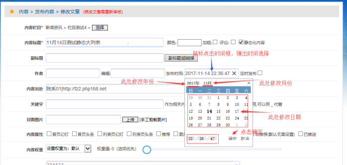 點擊發布日期框----再選擇所需日期(網站排序按發布時間排序,最近時間發布的,排在最前面;可以通過發布時間,修改排序先后)