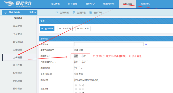 進入網站后臺后----點擊“系統設置”----點擊“上傳設置”----修改縮略圖的大小。