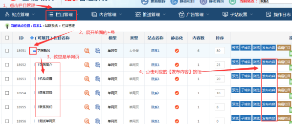 進入子站后臺,點擊【欄目管理】-----點擊展開單網頁一級目錄前面的【+】號-----看到對應的單網頁內容后