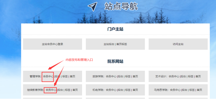 打開統一登陸入口------點擊各子站的【會員中心】入口------鼠標放在【站點管理】按鈕上-----點擊【管理入口】: