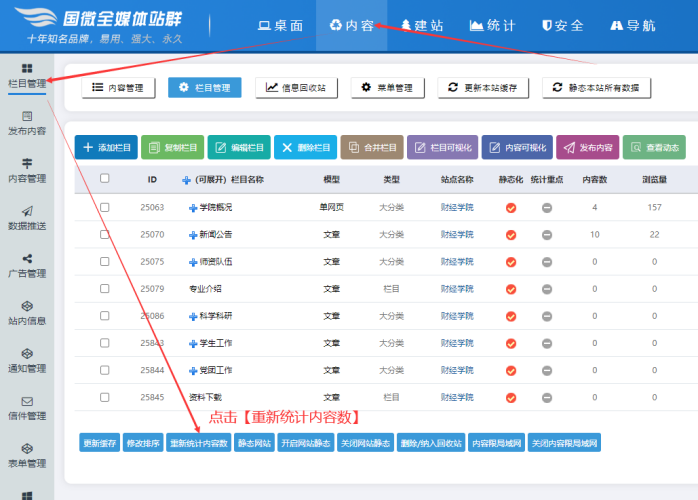 方法:在子網站后臺-----點擊【內容】按鈕-------點擊【欄目管理】-----點擊【重新統計內容數】:
