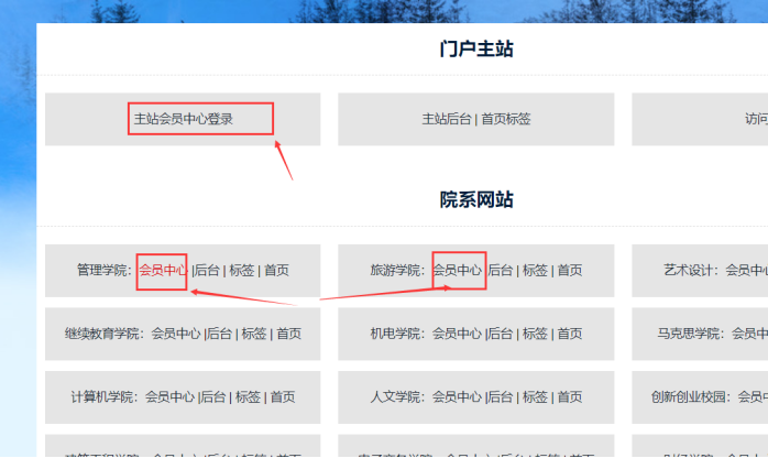 各個(gè)站點(diǎn)管理員需收藏此頁面,所有用戶在此界面登錄。如果是主站門戶就點(diǎn)擊【主站會(huì)員中心】,如果是子站就點(diǎn)擊各子站【會(huì)員中心】。然后輸入賬戶密碼進(jìn)行登陸即可。