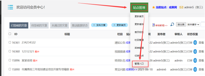 B、進入自己站點的【會員中心】-----點擊【站點管理】-------點擊【管理入口】---提示登陸后,再次輸入賬戶密碼