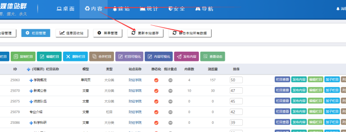 C、點擊【內容】-----點擊【更新本站緩存】-------點擊【靜態本站所有內容】