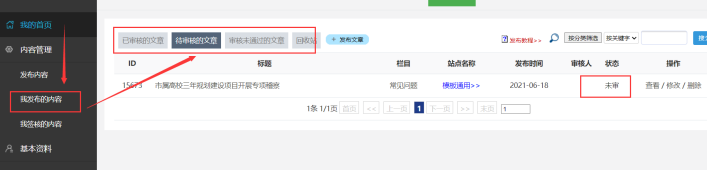 如果我們想查看自己發(fā)布過(guò)的內(nèi)容審核狀態(tài),或者修改自己的內(nèi)容,可以查看此功能。已經(jīng)被審核的內(nèi)容,系統(tǒng)管理員可能會(huì)禁止發(fā)布人修改內(nèi)容。