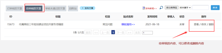 點(diǎn)擊【待審核的文章】------點(diǎn)擊【修改或刪除】即可。一般情況被審核了的內(nèi)容,一般權(quán)限的投稿員無(wú)權(quán)限修改或刪除。