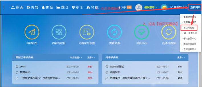 進入子站后臺界面------鼠標放在【查看網站】上面------點擊【首頁可視化】-----進入可視化查看: