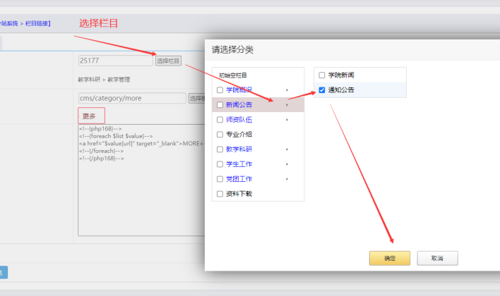 在對應顯示的頁面----點擊【選擇欄目】按鈕----選擇一個對應的欄目-----點擊【確定】: