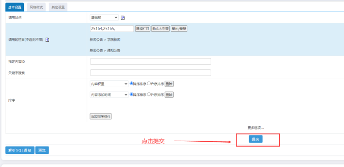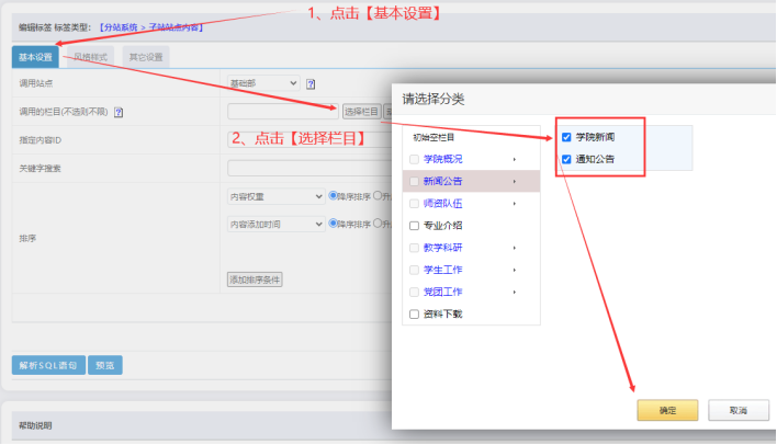 在對應顯示的頁面----點擊【基本設置】------點擊【選擇欄目】按鈕-------選擇一個對應的欄目(可以勾選一個或多個欄目)-----點擊【確定】: