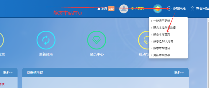 進入本站后臺------鼠標放在【更新網站】按鈕上--------點擊【靜態本站首頁】: