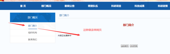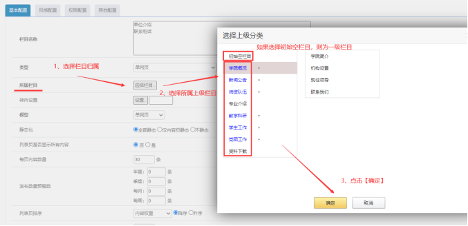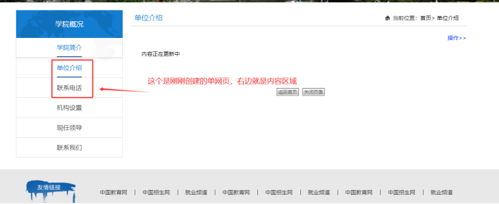 【下屬欄目】:如果選擇的是下面對應的欄目(需要選那些藍色文字的欄目,因為那些都是大分類;比如選了“學院概況”,這個新創建的單網頁欄目就屬于“學院概況”下面)。