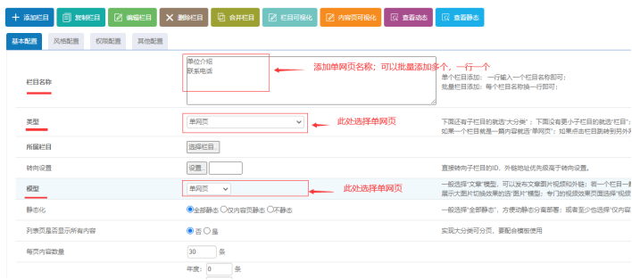 1)、單網頁模型的信息填寫:先添加【欄目名稱】,就是輸入單網頁欄目名稱,可以批量添加-------選擇欄目類型為【單網頁】-------接著選擇【模型】為【單網頁】;選擇情況如下: