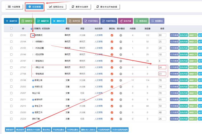 3)、單網頁欄目排序:點擊【欄目管理】-------點擊【展開欄目】-------【設置排序】,在這個大分類下,數字大的排在前面-----------點擊【修改排序】。 選擇效果如下: