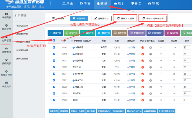 查看效果:點擊【欄目管理】------點擊【展開欄目】------勾選這個創建的欄目-----點擊【靜態網站--靜態欄目】---再點擊【欄目查看--查看靜態預覽】。這樣這個單網頁就創建好了