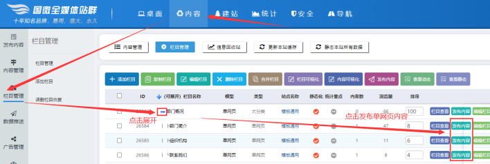 點擊【內容】---【欄目管理】----【展開欄目】----點擊【發布內容】