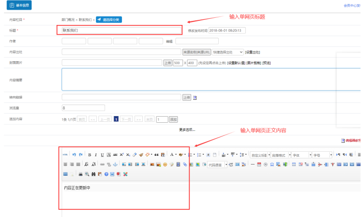 我們經常碰到一種現象,就是一個欄目就是一篇內容,并且用途廣泛,比如【單位介紹】、【聯系我們】。這個就需要用到【單網頁】模型,單網頁的效果如下: