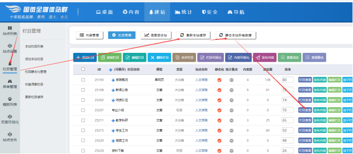 點(diǎn)擊【欄目管理】即可看到后臺(tái)效果,如果要前臺(tái)效果也生效-----需要點(diǎn)擊【更新本站緩存】-----勾選所有欄目后,點(diǎn)擊【靜態(tài)本站所有內(nèi)容】-----點(diǎn)擊【靜態(tài)預(yù)覽】,刷新模板頁(yè)面即可看到效果