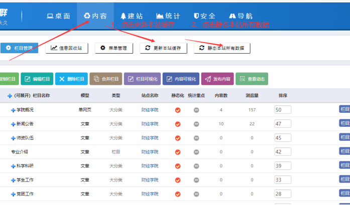 方法:在子網(wǎng)站后臺(tái)-----點(diǎn)擊【內(nèi)容】按鈕-------點(diǎn)擊【欄目管理】-----點(diǎn)擊【重新統(tǒng)計(jì)內(nèi)容數(shù)】: